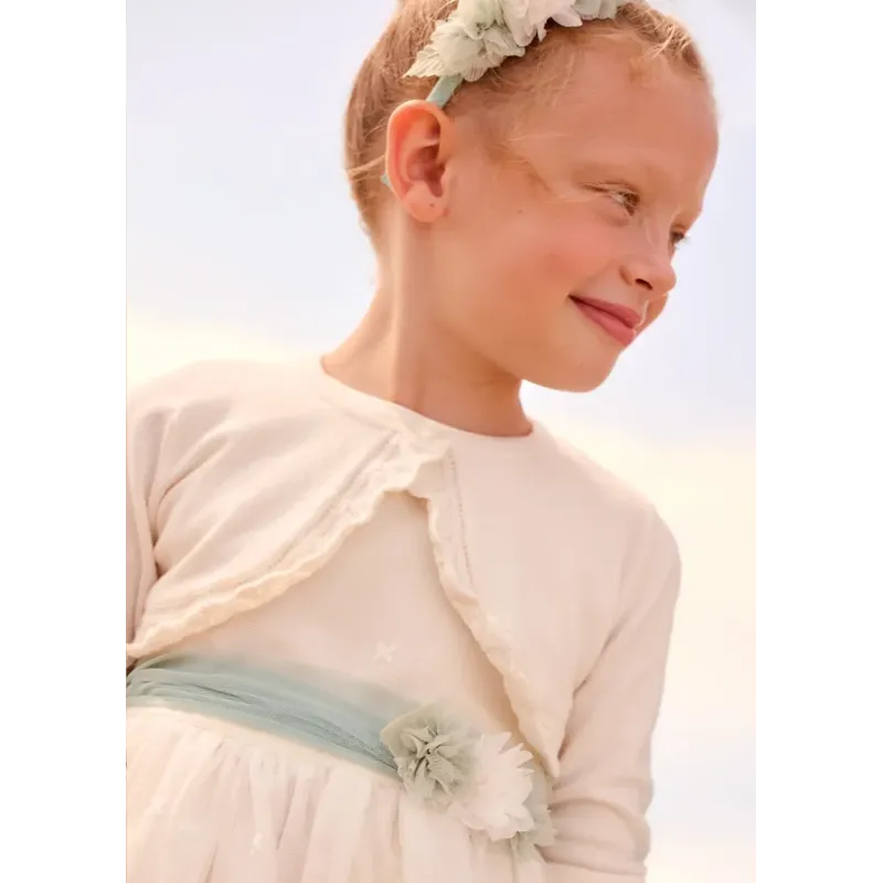 Sweterek typu bolerko z bawełną zrównoważoną dla dziewczynki. Zapięcie na jeden guzik. Trykotowa dzianina, delikatna i przyjemna w dotyku. Ozdoby: elementy ażurowe.