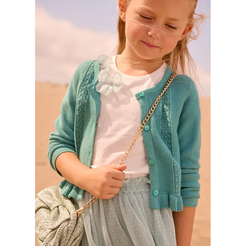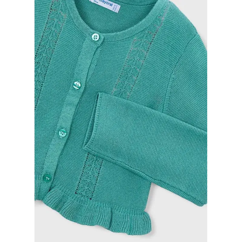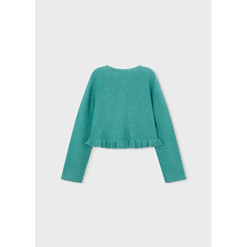 Rozpinany sweterek z dekoracyjną falbanką dla dziewczynki. Skład: 49% Wiskoza, 25% Bawełna, 25% Akry, 1% Poliamid.