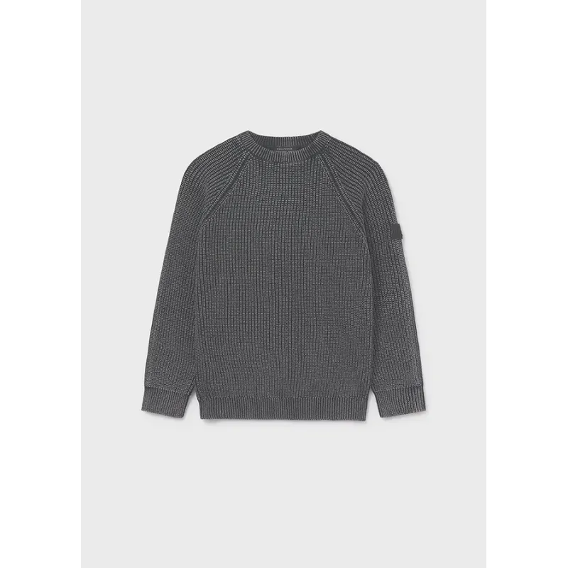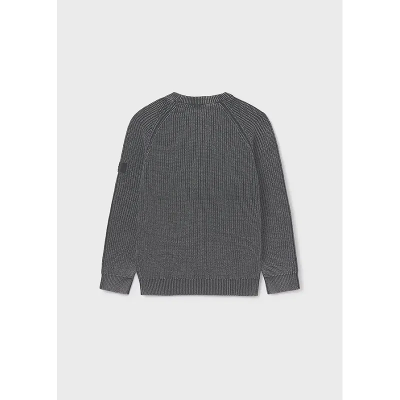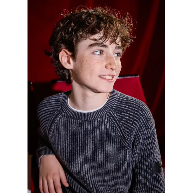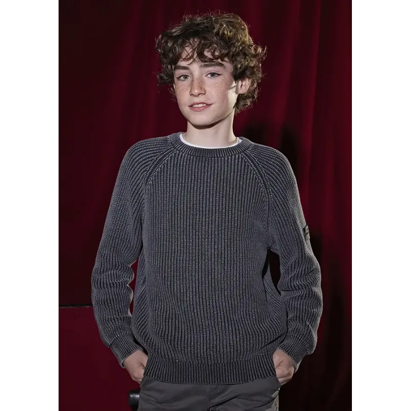 Gruby, prążkowany sweter z długim rękawem dla chłopaka. Okrągły dekolt. Model gładki. Skład: 100% Bawełna