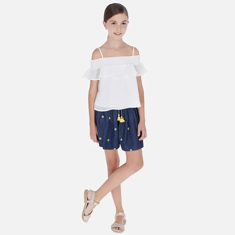Spodnie typu szorty dla dziewczynki. Zapięcie na suwak i guziki. Delikatna i elastyczna bawełna. W pasie znajduje się wyciągany pasek. Zarówno przednie jak i tylne kieszenie są funkcjonalne.