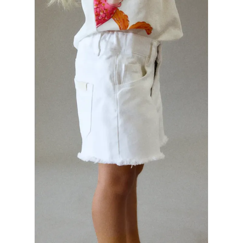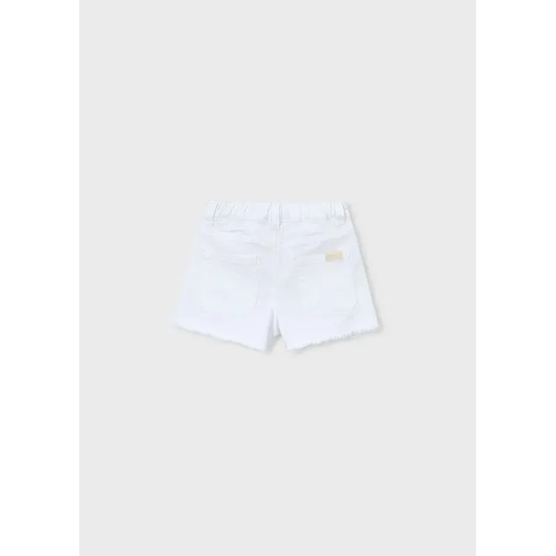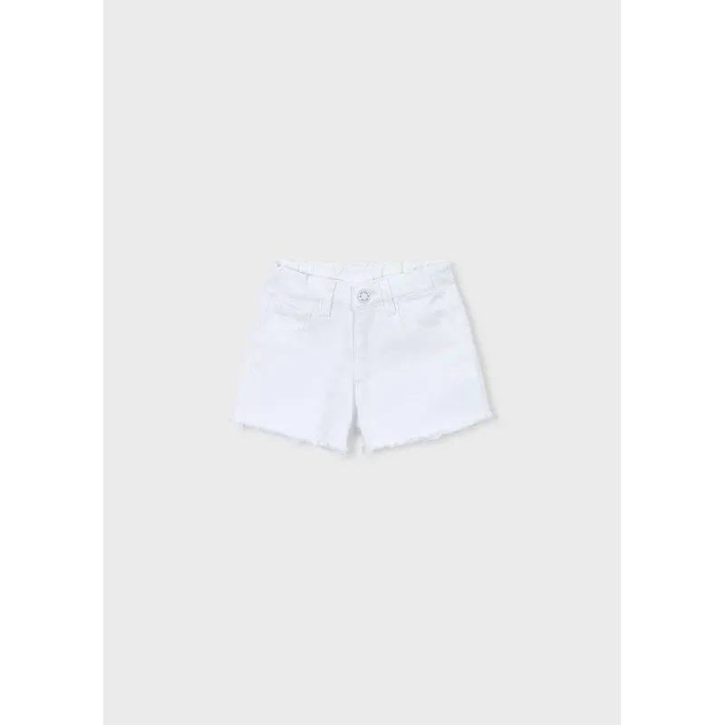 Krótkie spodnie typu szorty dla dziewczyny. Pasek z elastyczną gumą i zapięciem na suwak i guzik. Jeansowa tkanina z efektem sprania, doskonała do codziennych stylizacji. Model z pięcioma kieszeniami.