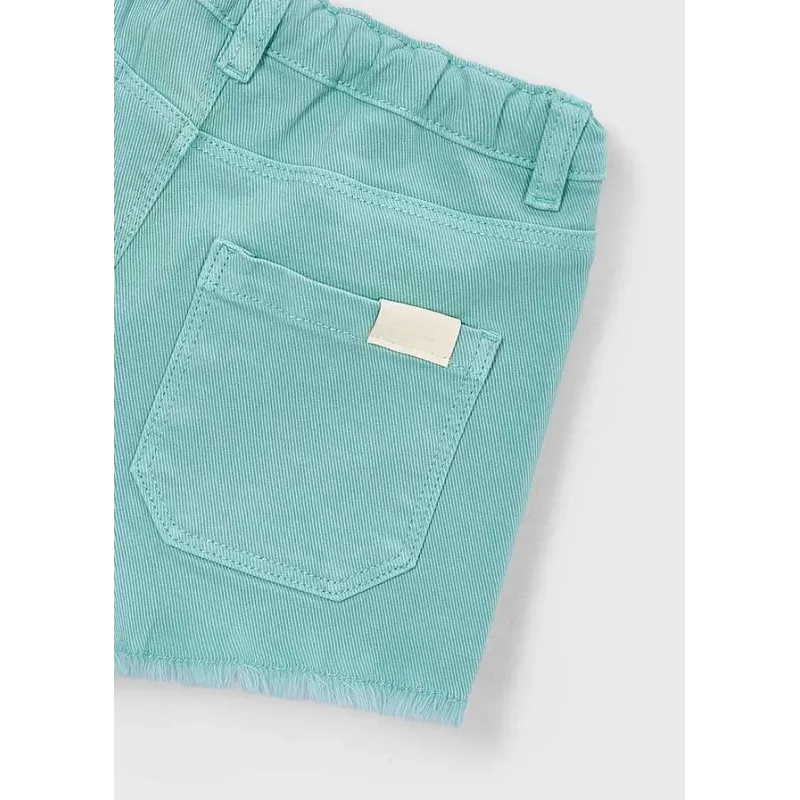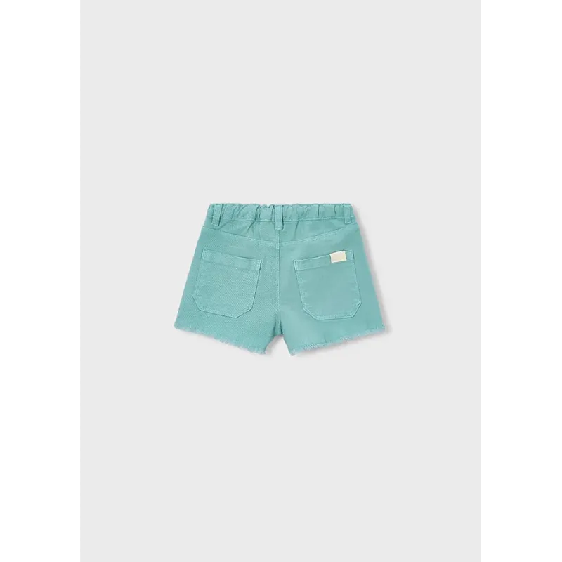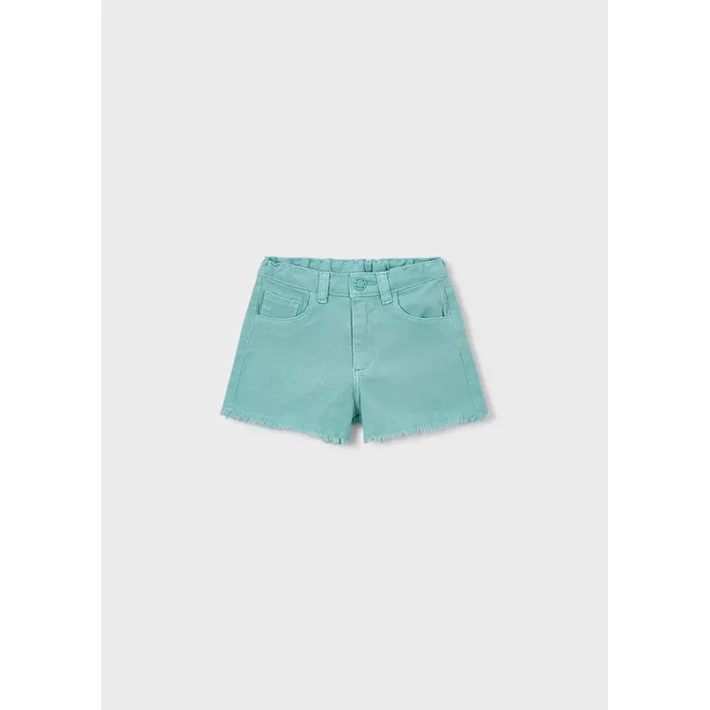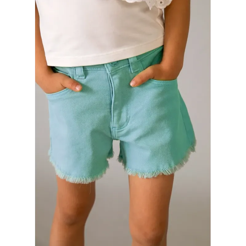Krótkie spodnie typu szorty dla dziewczyny. Pasek z elastyczną gumą i zapięciem na suwak i guzik. Jeansowa tkanina z efektem sprania, doskonała do codziennych stylizacji. Model z pięcioma kieszeniami.
