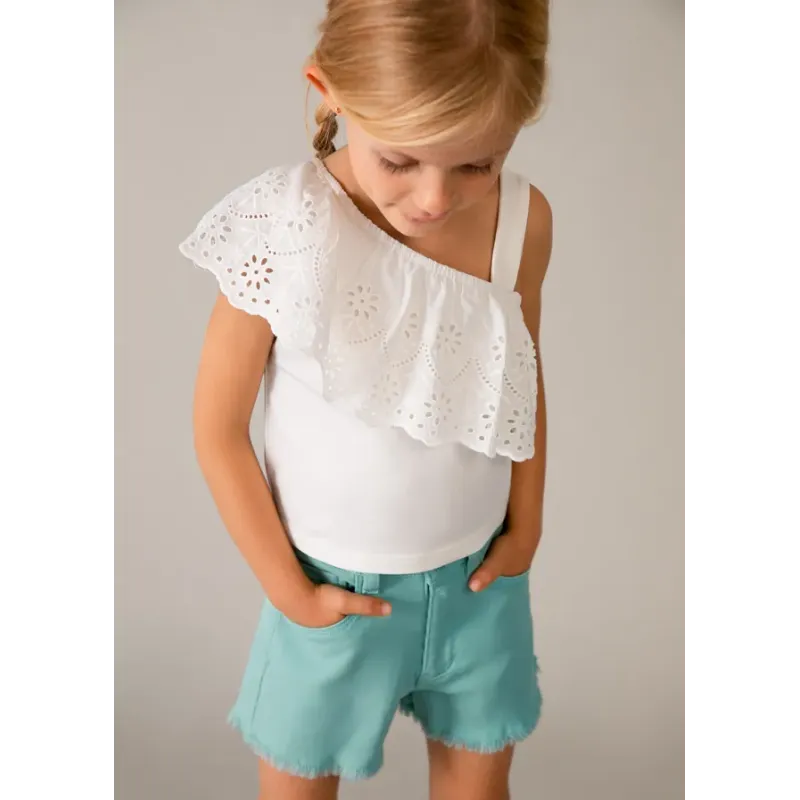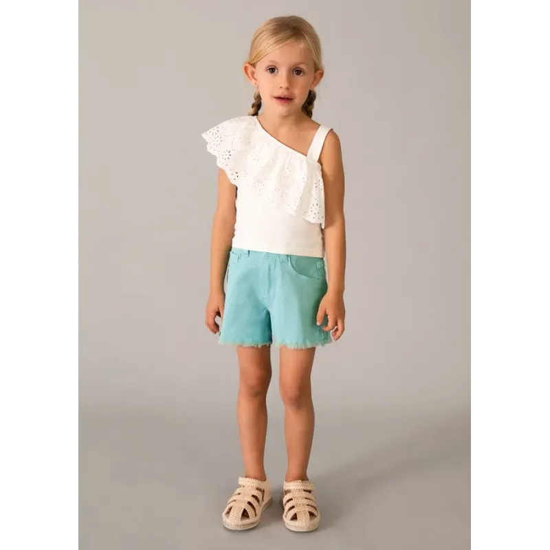 Spodnie typu szorty dla dziewczynki. Zapięcie na suwak i guziki. Delikatna i elastyczna bawełna. Zarówno przednie jak i tylne kieszenie są funkcjonalne. Perforowana bawełniana tkanina jeansowa. Artykuł wykonany ze 100% bawełny.